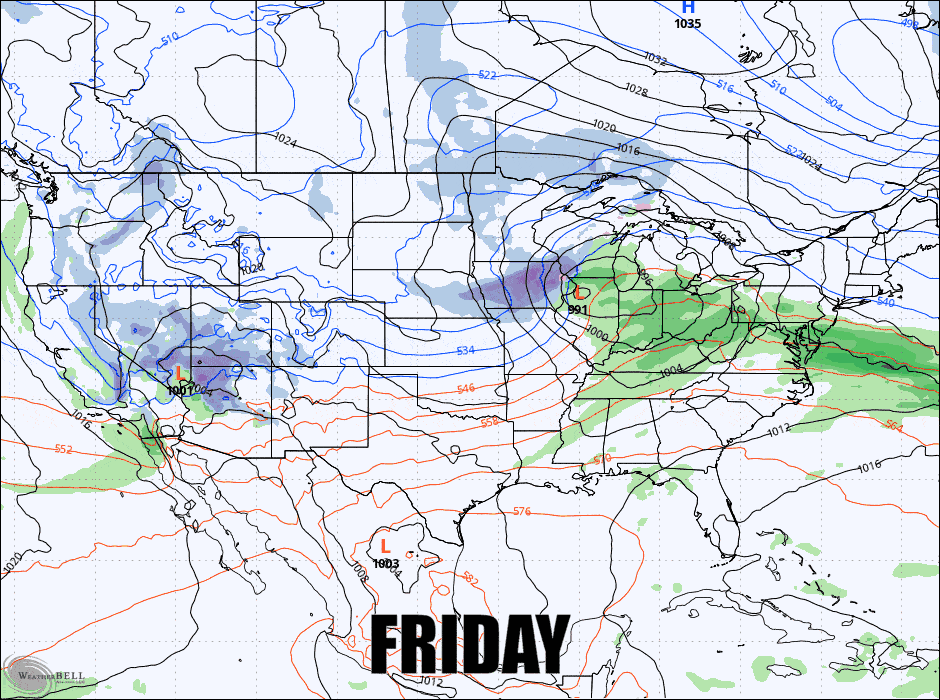 This update will primarily deal with the Fri-Sat storm but I will also provide an update for the Sun-Mon storm. Here's the latest GFS below showing the surface weather Friday through Monday.