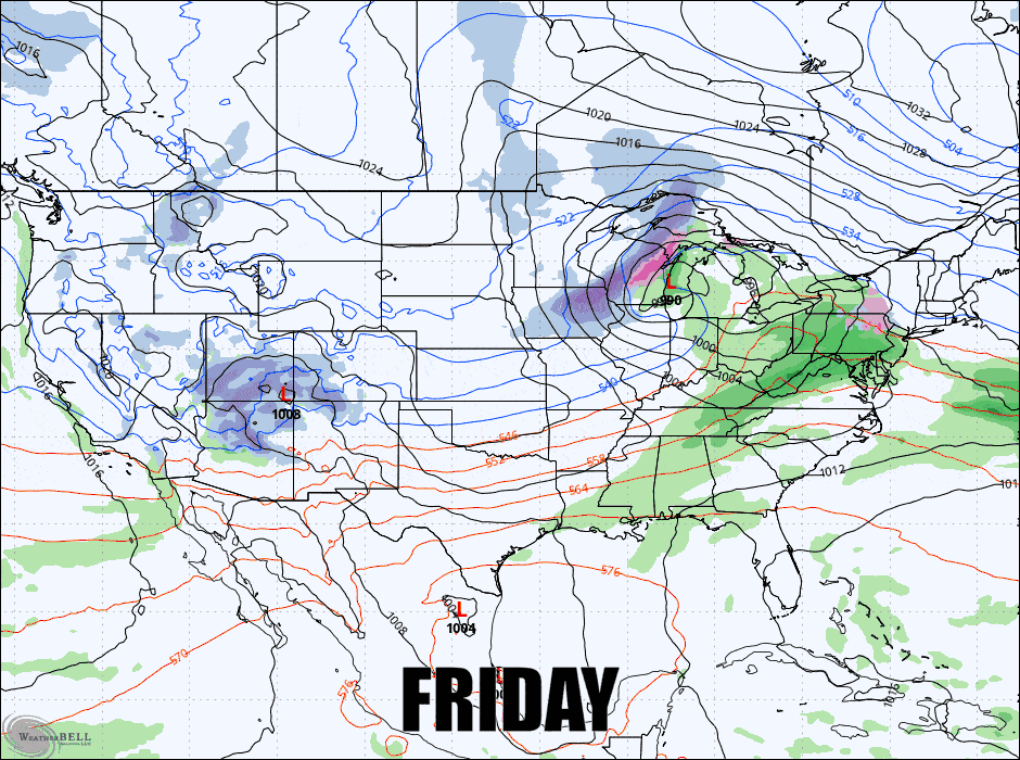 Let's start off as always with the broad view and I've again stretched this to Tuesday morning in order to also give a view of the nor'easter. I so believe there is a growing chance of moderate to heavy snow in Southern New England and also some snow in PA on Sunday, and possibly into E-PA and NJ. I will be issuing a separate Storm Update for the Sun-Mon storm later today.