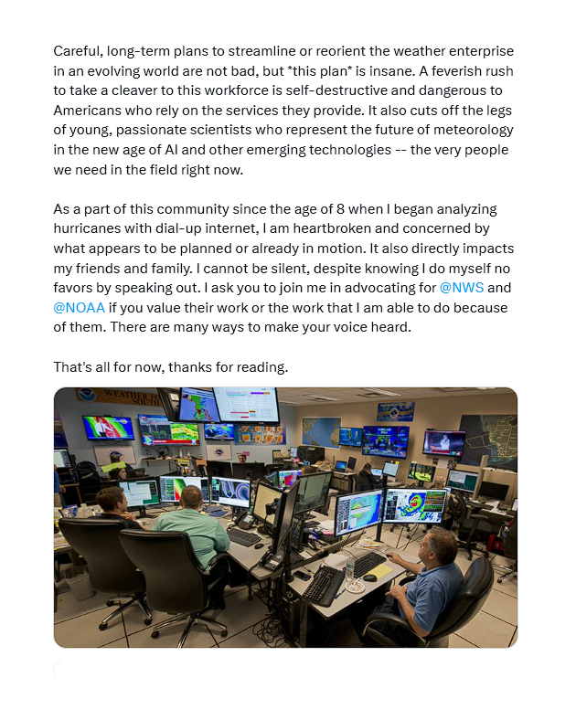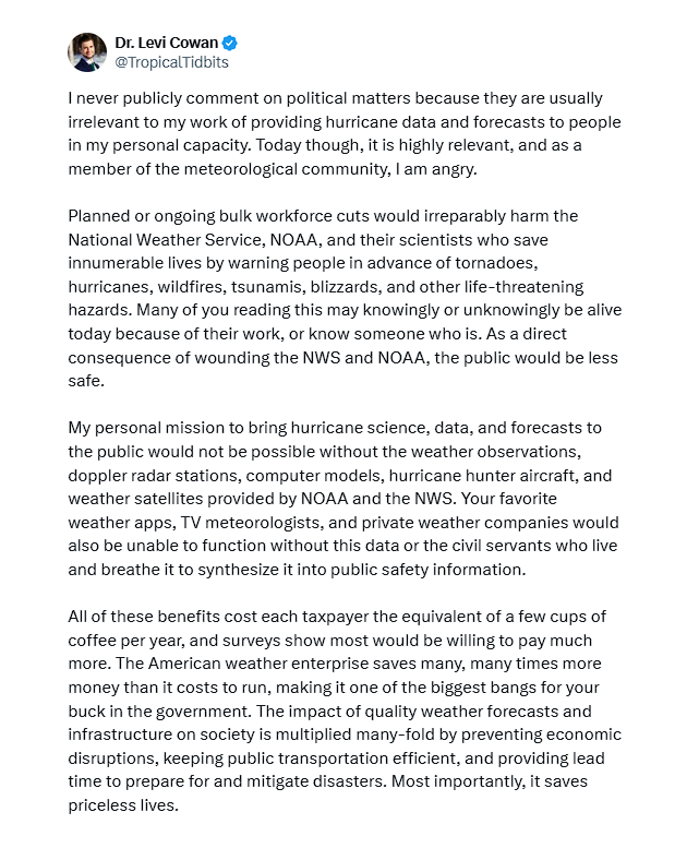 Many of you may not know who Dr. Levi Cowan is, but it is because of his work on TropicalTidbits for over a decade that Snowology exists. It is a free to use and voluntary to support resource, and we have supported his individual efforts for years. Still to this day we frequently display model data that is generated by his site. Dr. Cowan is currently a leading researcher and forecaster for the Joint Typhoon Warning Center and so was his wife who was terminated yesterday subsequent to sharing this message as part of cuts which aim to reduce staffing by approximately 50%.