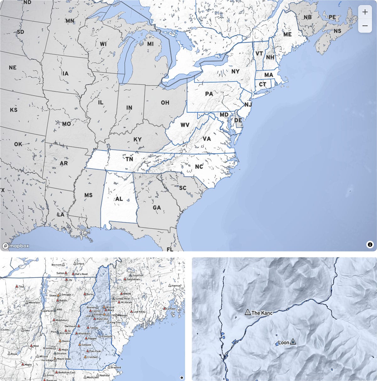 When you first reach this part of the site you will be presented with both a map for navigating and exploring, and a list of ski areas below that can be selected by state, region, and by major ski pass. As you zoom in ski areas will appear on the map based on their chairlift capacity which approximates their popularity, and our goal is to list every single ski area that is operating in the East. Clicking on a ski area in the map or in the list below the map will send you to the dedicated page for that ski area.