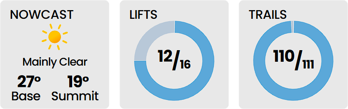 This section focused on the current weather and the number of lifts and trails that are open. Currently we are updating the Nowcast once an hour though we will eventually change this to every 15 minutes. For Lifts and Trails we are using data reported by ski areas to SnoCountry. In the event a ski area doesn't report to SnoCountry we will simply display the maximum number of lifts and trails. We attempt to detect the maximum number of lifts and trails open during a ski day rather than trying to keep this updated in real time.