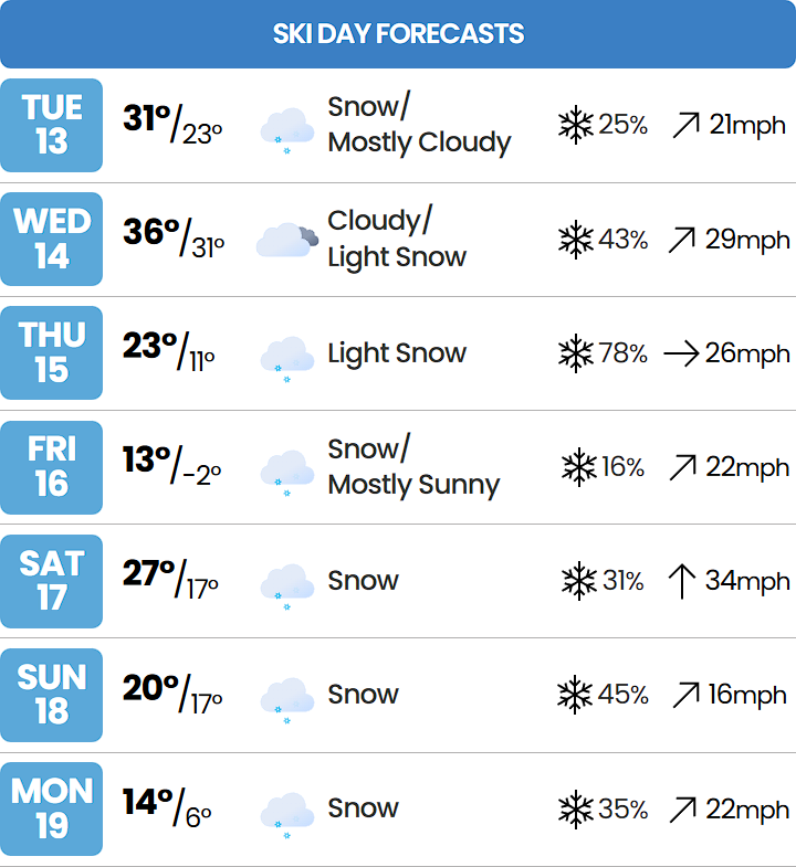 In this section you will find the temperatures, wind gusts, and conditions expected between 8AM and 4PM every day. We've labeled this as the "Ski Day" so that it is easy to identify the weather that you will find.