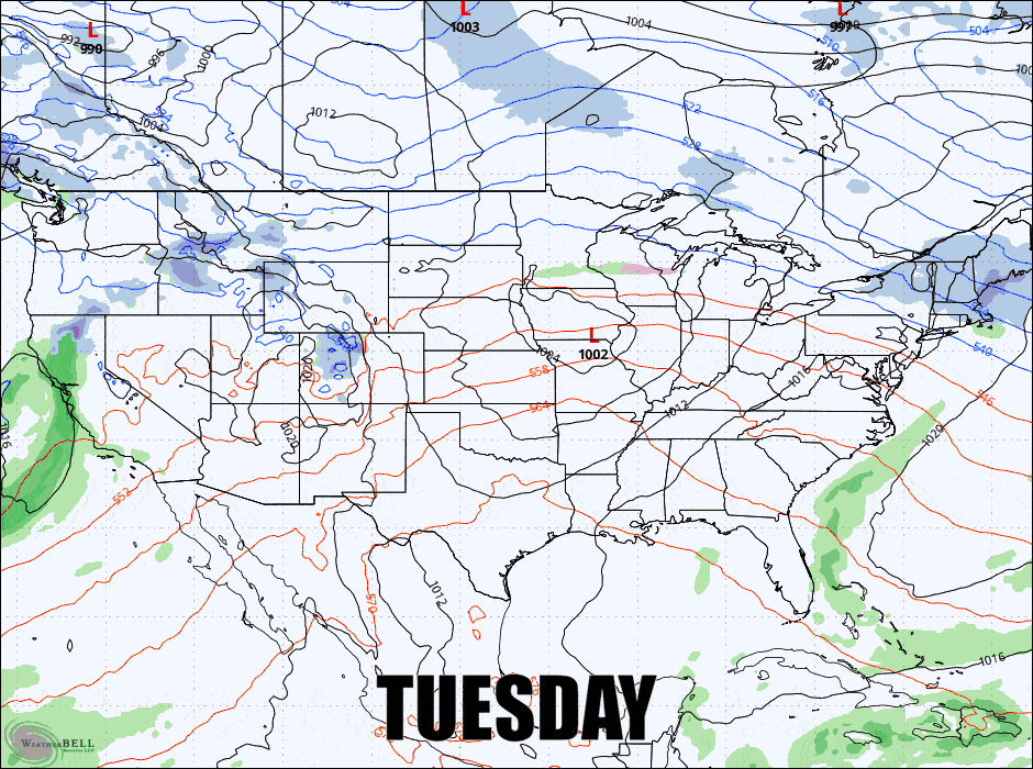 Monday AM through Tuesday AM: The last in our series of weak shortwaves coming through the northwest flow will drop 1"-4" with most of the snow in New England coming after close today. The abnormally cold temps in the northern half of the region will depart with this storm.