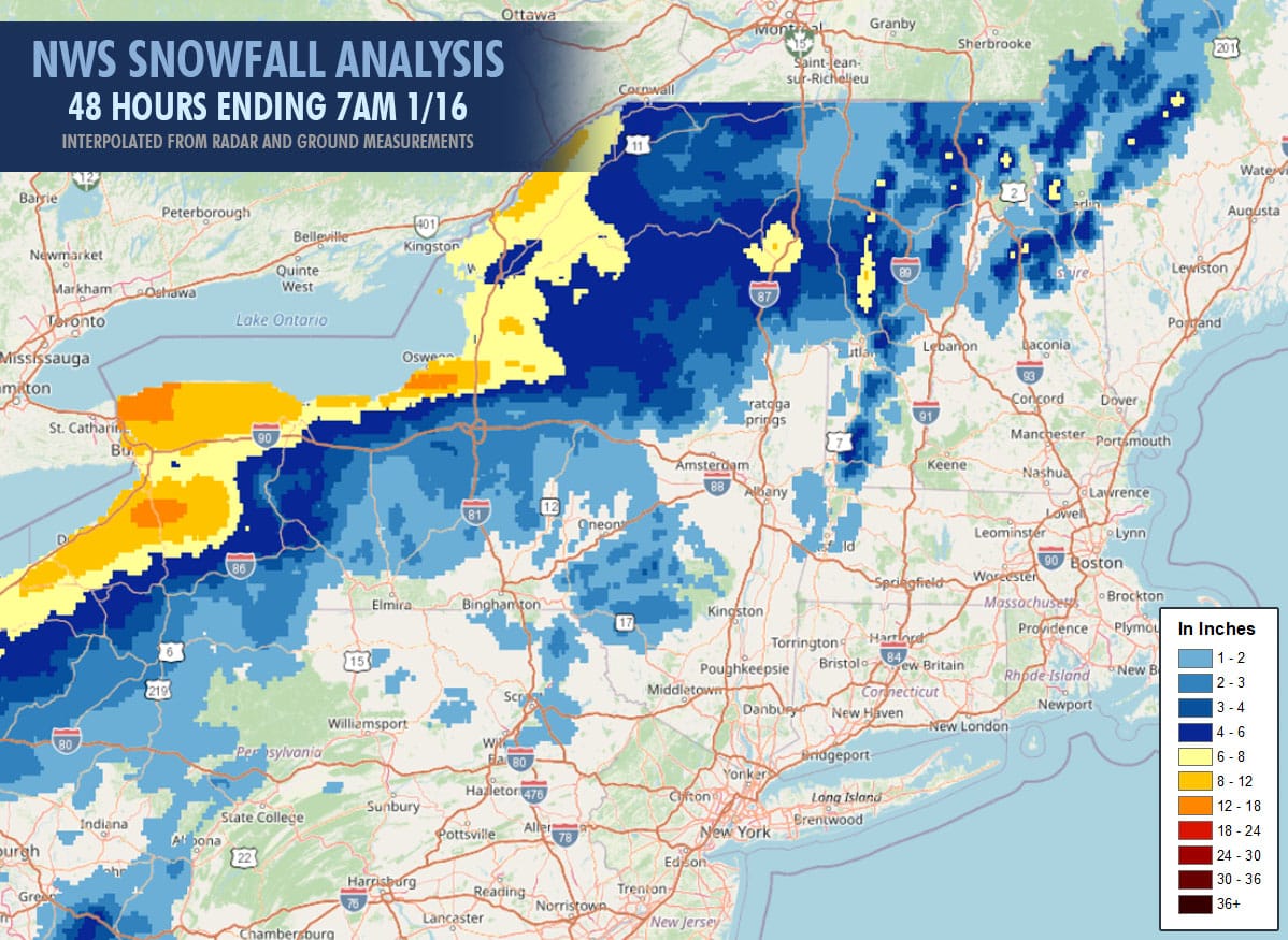 Here's the NWS Snowfall Analysis for the last two days. Keep in mind that in most cases we saw rain at the bases. The back end of this storm did underperform as a second unmodeled low formed in W-NY which prevented the storm from pulling the back end east and it also came in notably more dry. Note that this analysis often comes in low on taller mountains though this does generally look only slightly low.