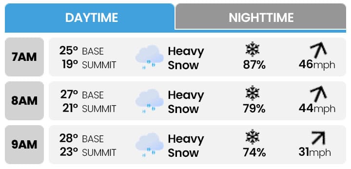 We are currently working on adding hourly weather summaries to our website forecasts and I expect that could happen as early as Friday. These summaries will list the base and summit temps, either precipitation or sky cover, the percentage chance of precipitation, and the gusts at the summit for every hour of the next 7 days. There will be an announcement when this drops.