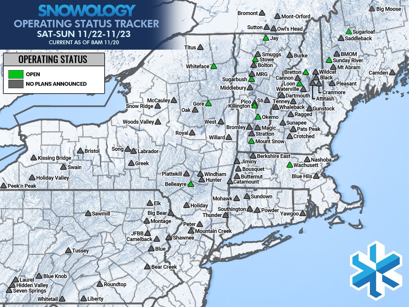 For this coming weekend we'll reach a minimum of 14 ski areas operating in the Northeast as of 8AM on Thursday 11/20. 10 of those 14 ski areas will also operating daily while 4 are opening just for this weekend before taking a break. This will be detailed for subscribers below. I've prepared an Operating Status Tracker covering just Saturday and Sunday, but note, there will be some openings on Friday as well and that will also be detailed for subscribers below.