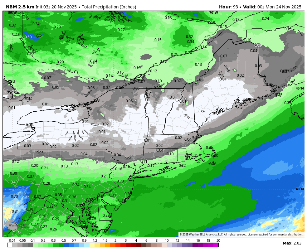 As far as weather goes there is only one day, Friday, out of the 3 days that could present some problems with light r@!n/snow, likely changing by elevation and temperatures as the day warms that are likely to cause natural snow to become sticky but this is unlikely to cause issues on manmade snow. Here's the precipitation expected this weekend, but note that the northern swath is likely to be all snow north of the St. Lawrence and an elevation mix into the northern parts of the Northeast.