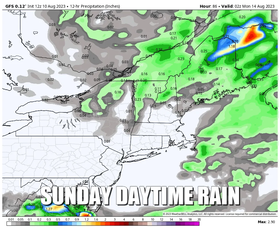 Through Saturday evening we should expect most of the rain to fall west of the Connecticut River, while on Sunday during the day we should expect most of the rain to fall east of the Connecticut River. The maps below show daytime rain on Saturday and then Sunday according to the GFS. It's best not to try to pinpoint at this distance with this type of precipitation since convection can be quite random. Should it rain where you are, generally you should expect it to last for more than 2 hours on both Saturday and Sunday.