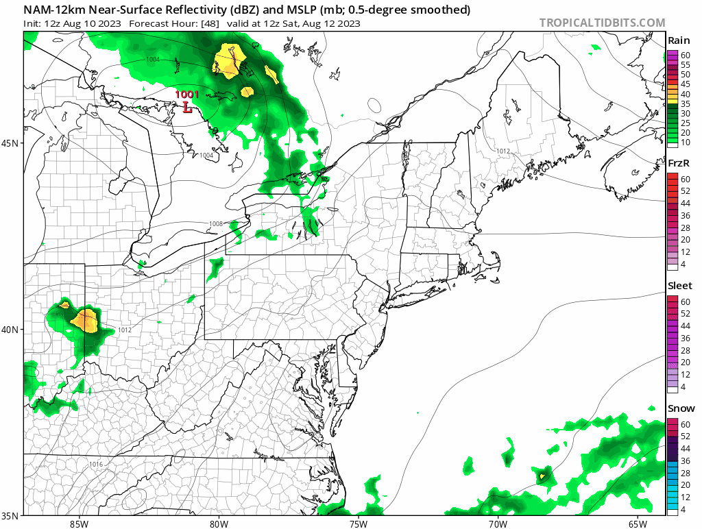 We have another system coming through the Northeast and Quebec beginning early Saturday in the western part of the region, and exiting Maine late on Sunday. This doesn't look like a full on rain out, but some moderate intensity thunderstorms are likely in parts on Saturday, with even less potential of stronger storms on Sunday as the rain departs. The following loop from the NAM12k model runs from Saturday morning through Sunday evening.