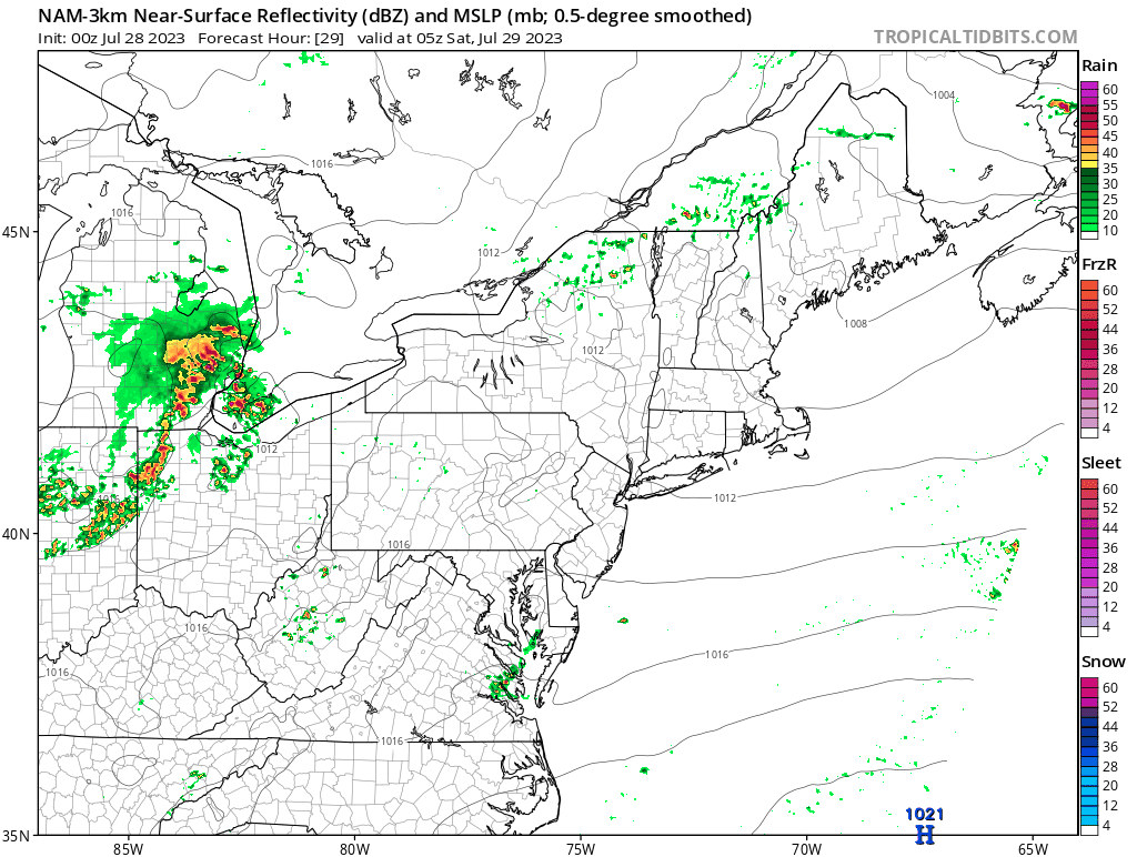 Saturday we have a weak low pressure with a trailing front that will move across the Northeast during the day. In the afternoon thunderstorms are likely to start to develop and become more intense in the early evening. Models unfortunately seem to be generally in two different camps for where this system will track which makes the exact impacts far less certain. The ECMWF and NAM3K see more of a southern path with the low moving from Western New York to Connecticut and then out to sea. This would put the thunderstorm risk mainly in Southern New York, Eastern Pennsylvania, New Jersey, and Southern New England. The loop below is from the NAM3K and spans all of Saturday. The GFS and HRRR models however see the low tracking due west, but with a secondary low forming around Philadelphia. This would mean an early drying of the northern areas and less intense thunderstorms. NWS forecasts seem to prefer the GFS/HRRR solution, but I'm going to call this a coin flip with everything in between a possibility. The long and the short of it is that your best chances for mostly dry weather in the afternoon on Saturday will be in the western and northern reaches of the Northeast. If you are planning to be out in the mountains Saturday, go prepared for some rain and possibly even some thunderstorms, especially from the Gore, Killington, Gunstock latitude and south, and east of the Finger Lakes longitude.