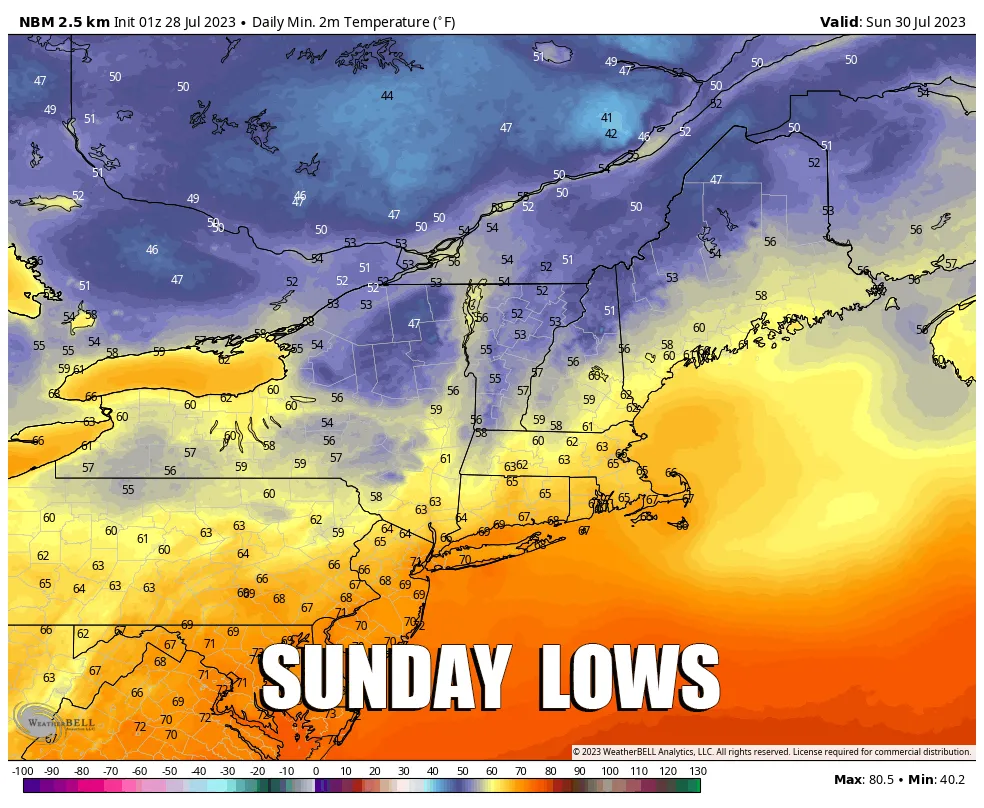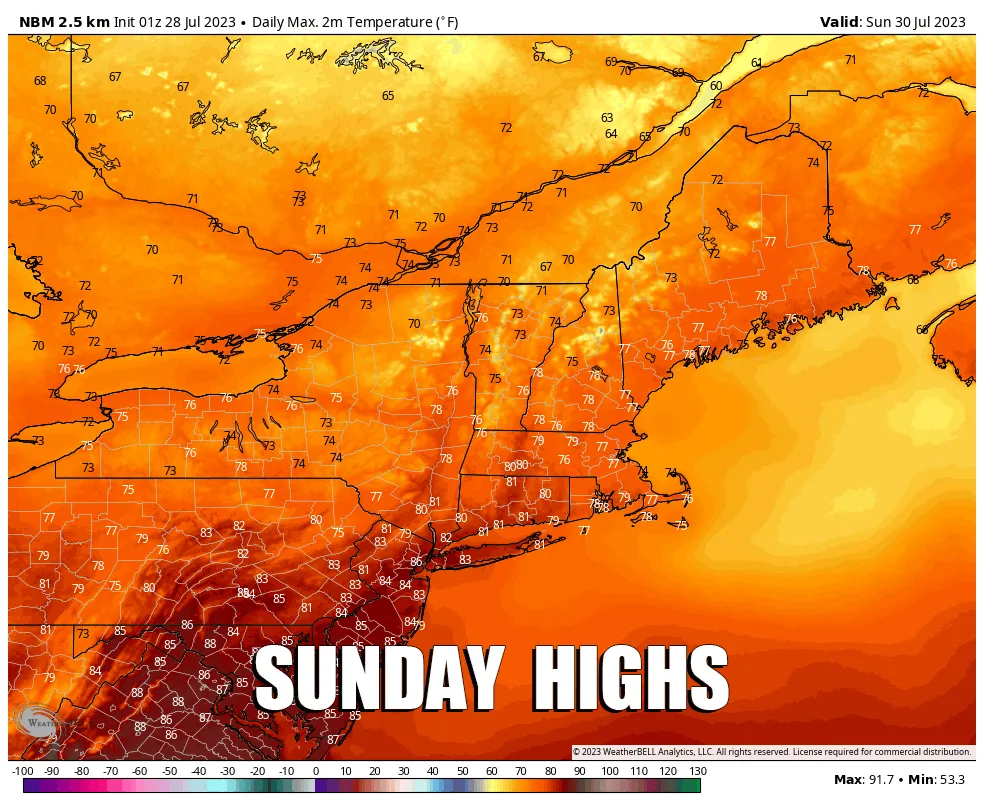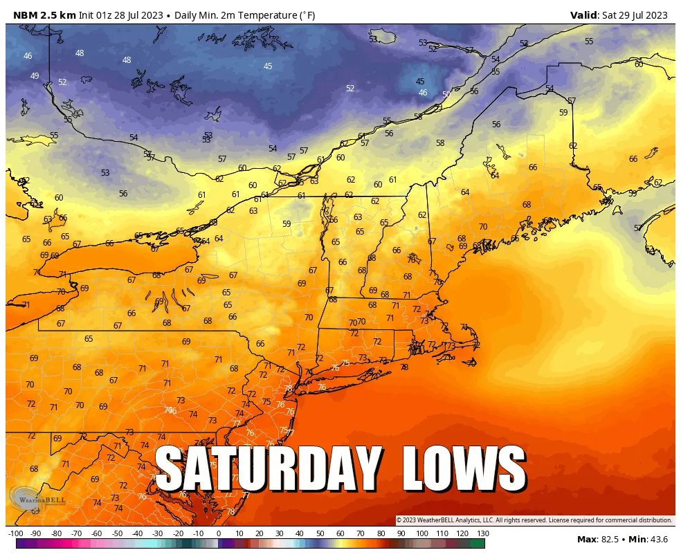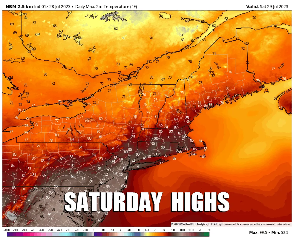 There was some concern about excessive heat late this week but forecasts have moderated. Saturday it will be muggy and fairly warm, but not excessively so, with some heat indices reaching the mid-90's and above in the corridor from Philadelphia to Boston. Further inland the precipitation and slightly cooler weather will help keep things way more tolerable. When it's hot in the summer you can counter it with altitude, in fact the more northern mountains will struggle to break 70F on their peaks. Beaches also work, but I don't really cover beach weather so head for the hills!